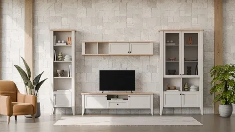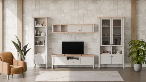 Comme chez Doğtaş, l’ensemble se compose de modules (meuble bas, éléments hauts, étagères, vitrines selon modèle) :